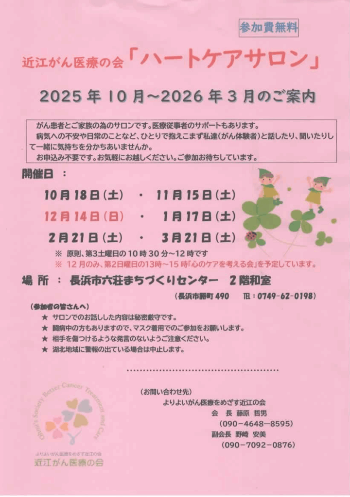 ハートケアサロン 10月~3月までのご案内 2025年11月15日 最終更新日時 : 2025年11月15日 admin_user がん患者とご家族のためのサロンです。 病気への不安や日常のことなど、ひとりで抱え込まず私達(がん体験者)と話したり、 聞いたりして一緒に気持ちをわかちあいませんか。お気軽にお越しください。ご参加をお待ちしています。
